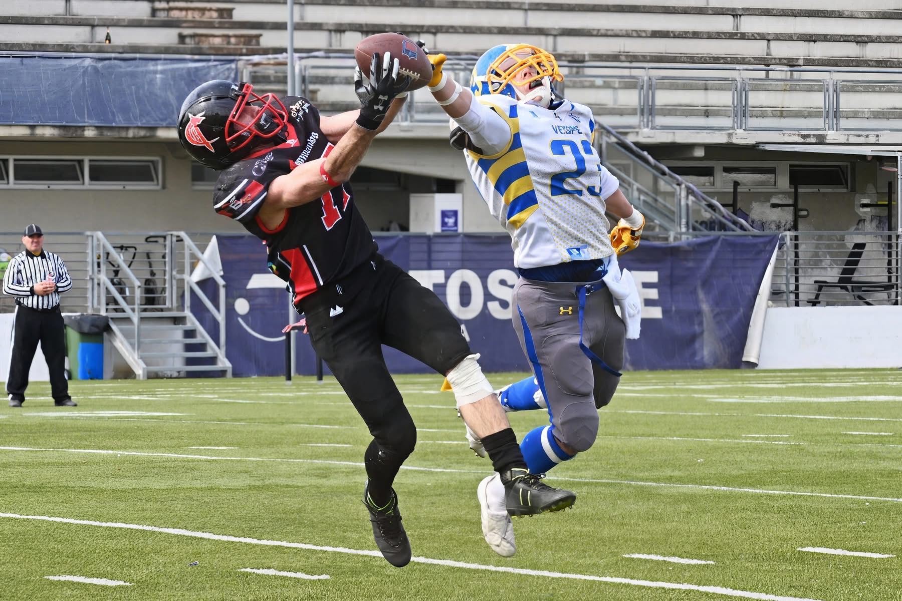Infatti, nonostante l’attacco brianzolo mantenga vivo lo spettacolo con i WR Rossi e Di Perna sapientemente imbeccati da Oprea, la difesa fortemente rimaneggiata e con ragazzi che mai quest’anno hanno giocato in determinati ruoli, non è piu riuscita a contenere le dilaganti corse avversarie portando il risultato finale sul 54 a 33.